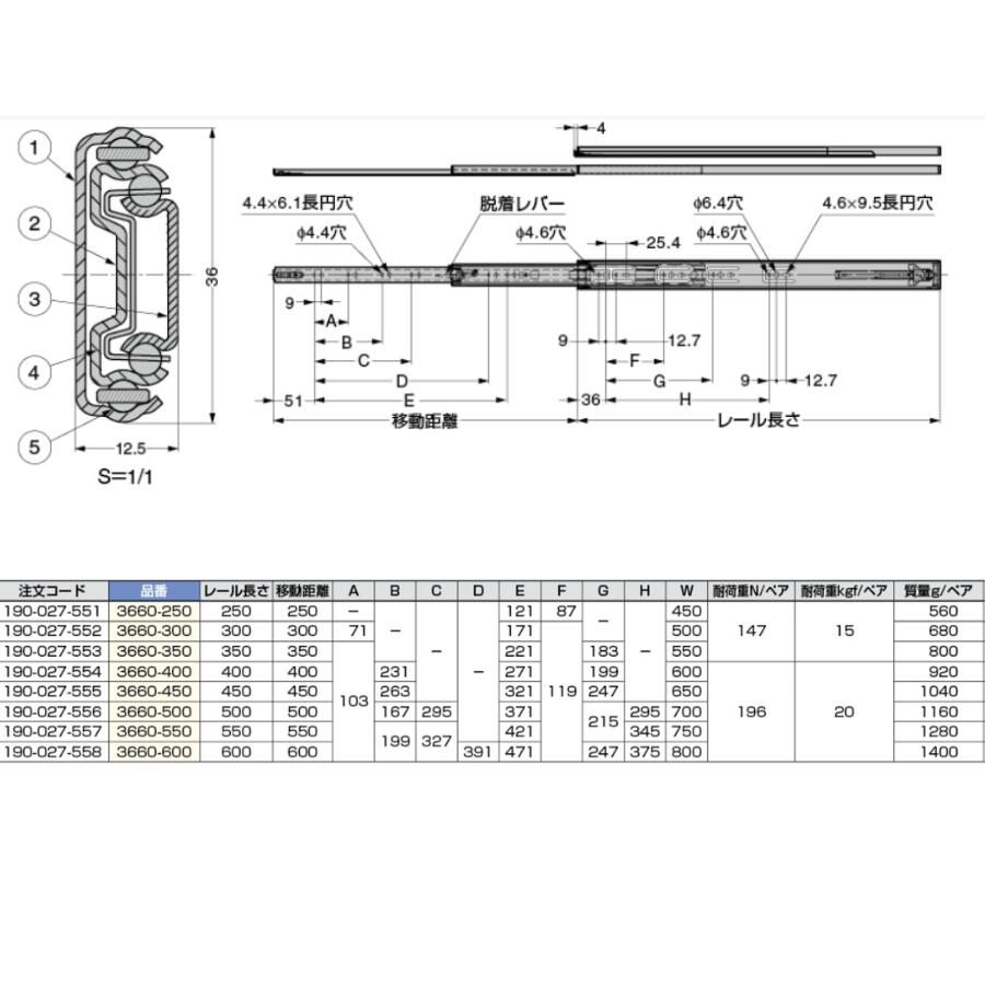 スライドレール「3660-500」|プッシュオープン機能・3段引き・長さ500mm
