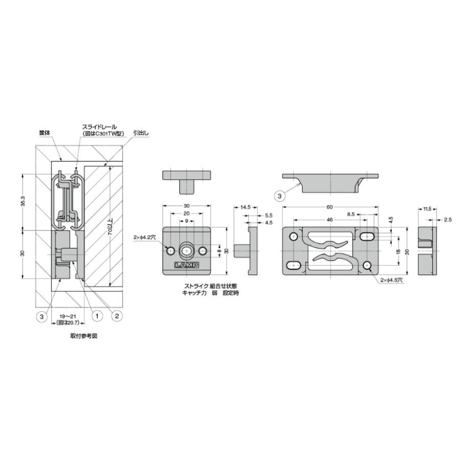 - C301TW 等の両トラベルスライドレールと併用することでセンターキャッチとして使用可能。