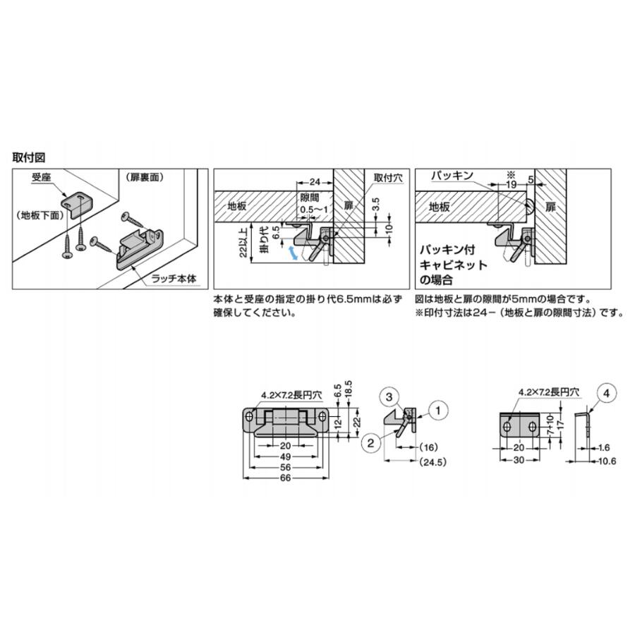- かぶせ仕様でキャビネット地板の下側まで伸びる扉に使用可能