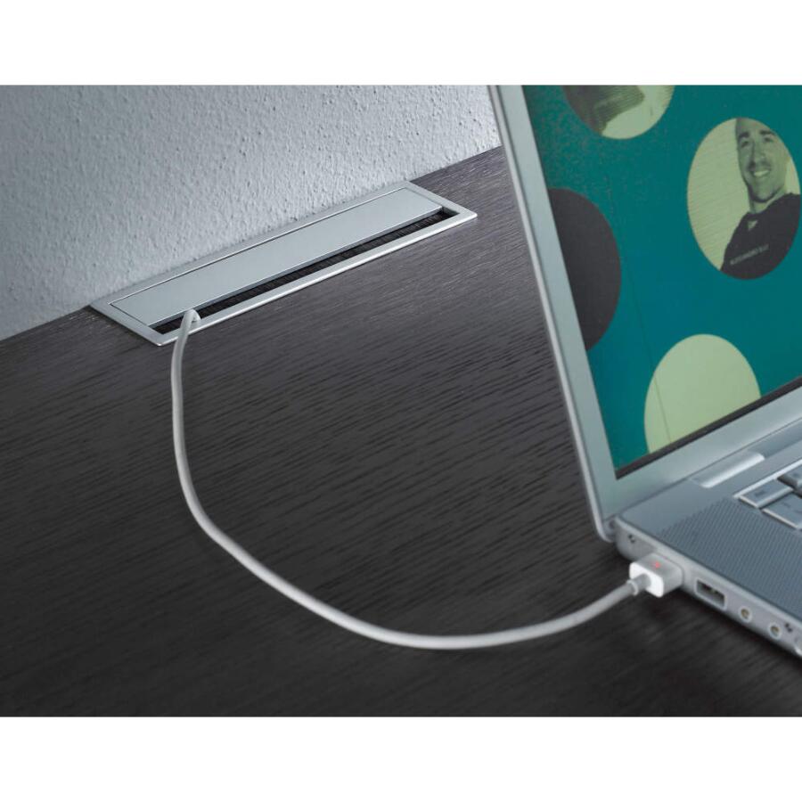 高級感のあるデザインの配線孔です。ブラシ付きのフタが大きく開くため、配線がしやすくなっています。