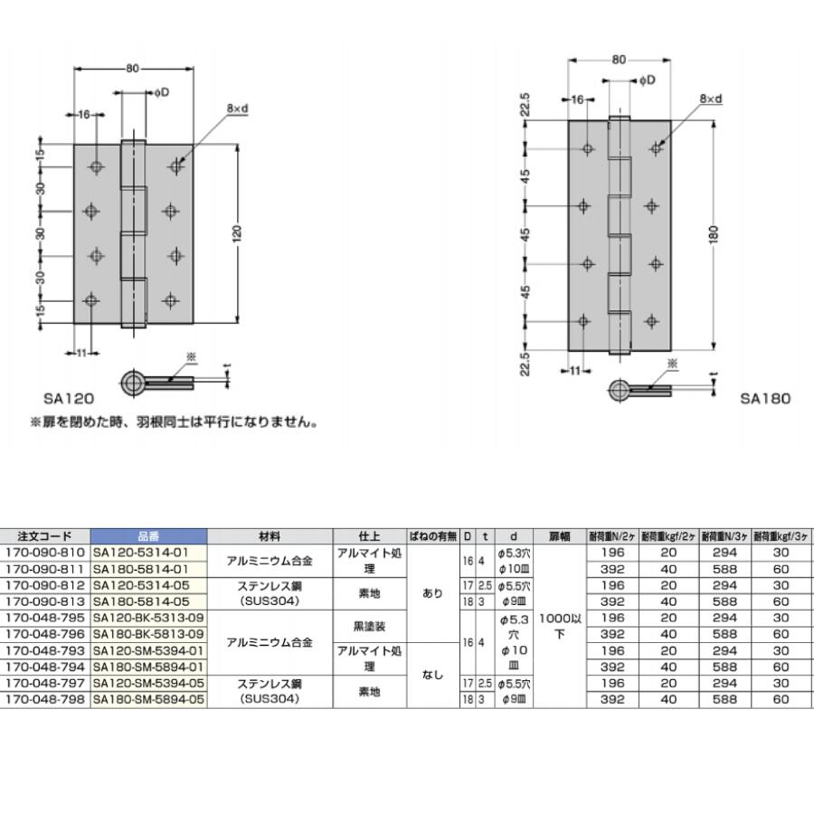 スプリング丁番 SA型 【SA120-SM-5394-05】ばね無し 仕上: 素地 扉幅: 1000以下 スガツネ工業 LAMP ランプ 170-048-797